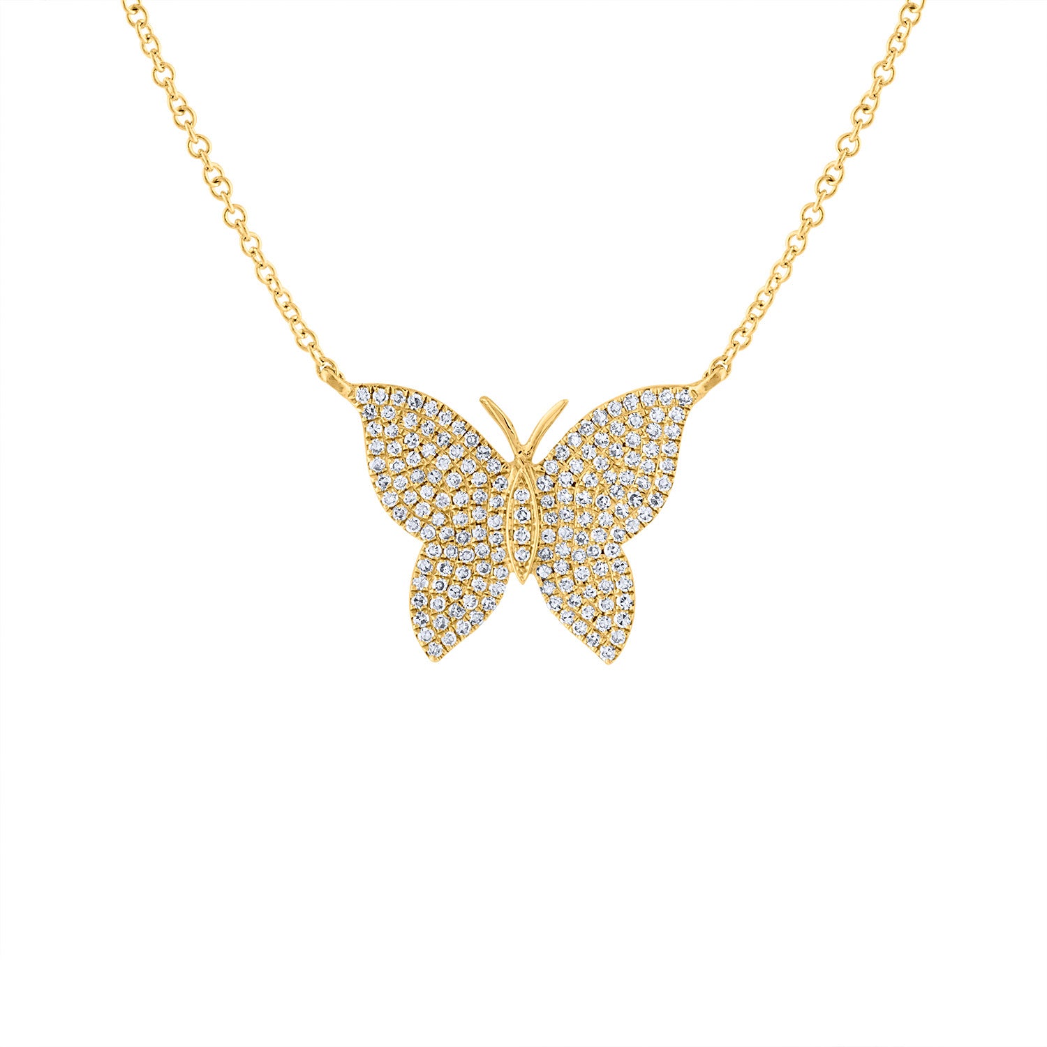 Fly away with this trendy and charming 14K Diamond Pave Butterfly Necklace. This whimsical piece will allow you to sparkle and shine at your next party. Wear this piece with a half-tucked tee and relaxed fit jeans for a precious 1990s throwback or pair it with a beautifully fit little black dress for feminine flair.