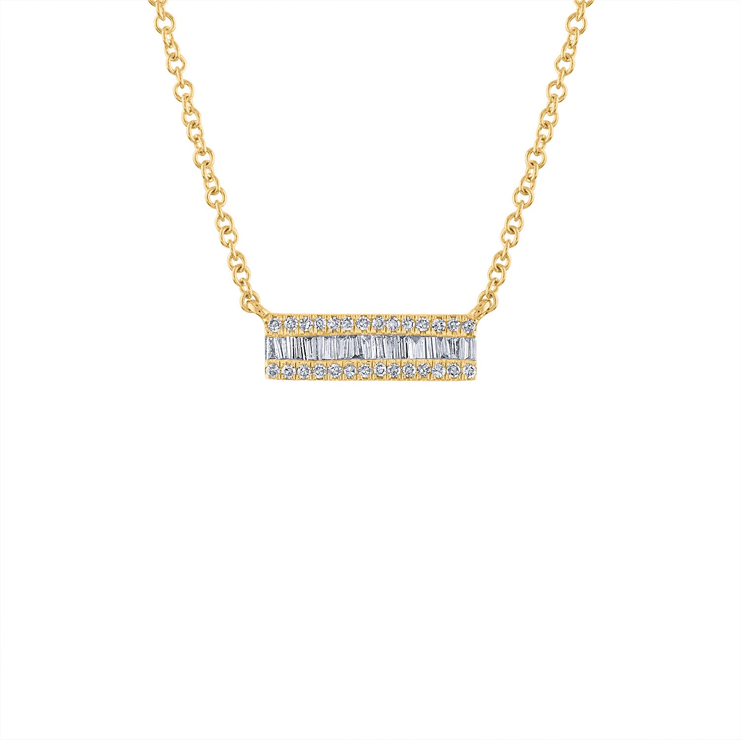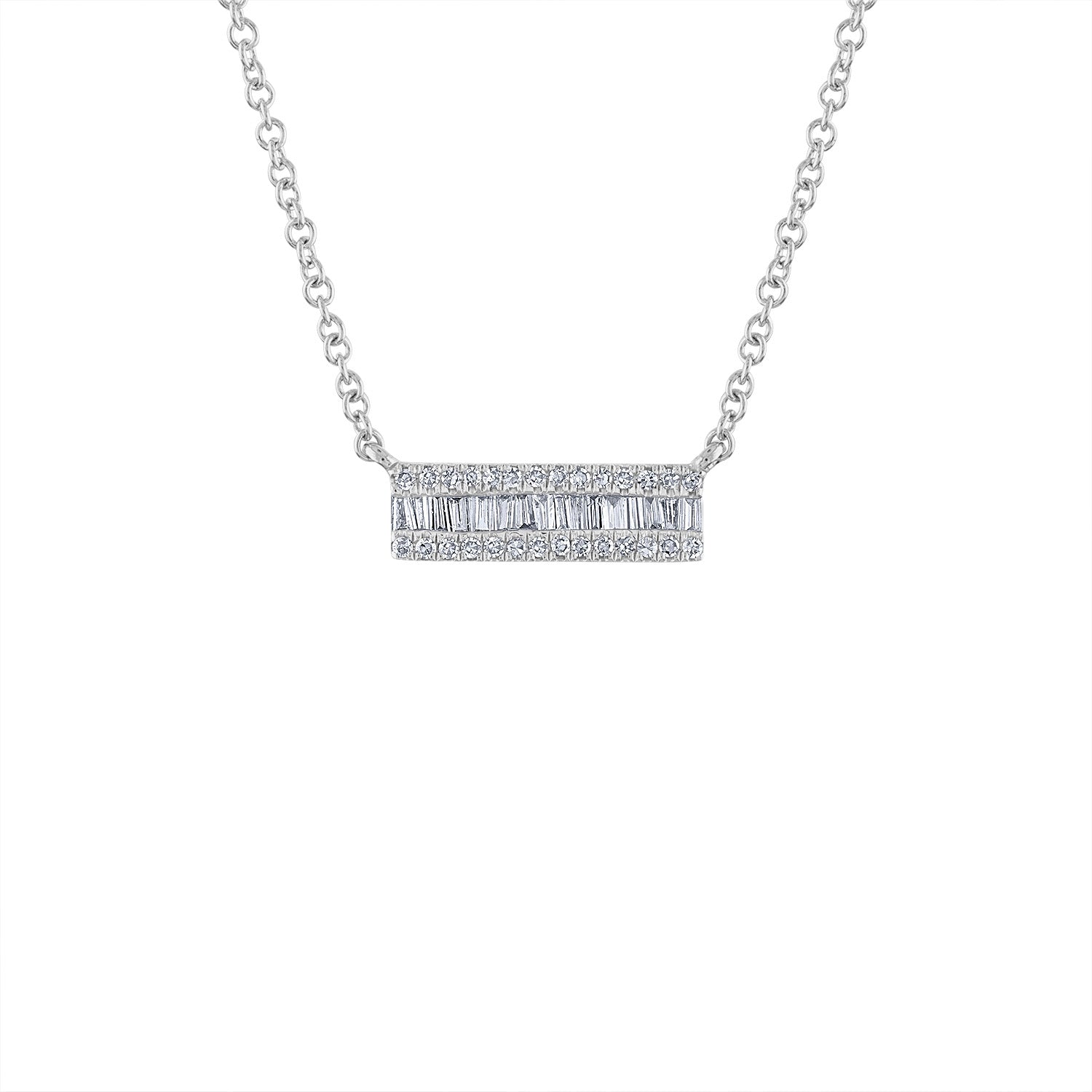 14KT White or Yellow Gold small diamond baguette bar necklace