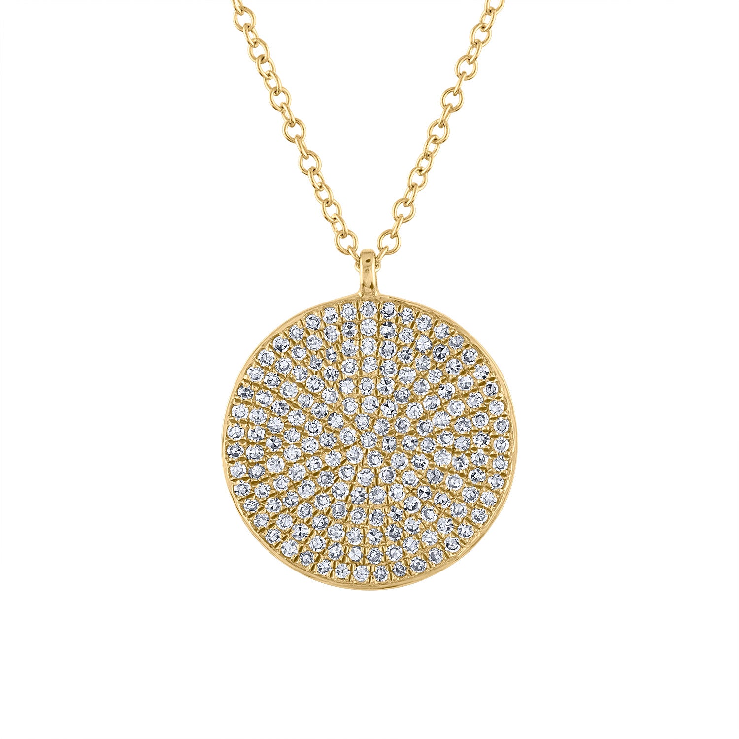 14KT White, Yellow or Rose Gold large pave diamond disk necklace